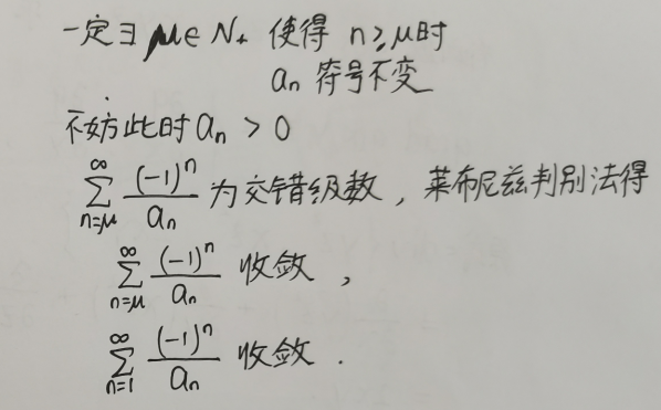 可以看出,一定有这样的特点:从数列的某一项开始,往后每一项的符号不会变化, 那么我们就可以忽略前面这有限项,仅考虑后面的级数(级数敛散性不变)