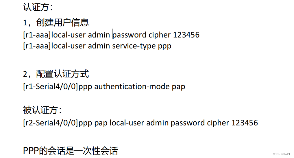 PAP——密码认证协议——被认证将用户名和密码以明文的形式发送给认证方,如果认证成功,则认证方回复ACK;否则回复NAK。