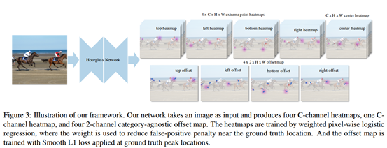 Eexterme Net的网络结构就是照搬的Center Net的网络结构,backbone还是Hourglass-Net,而且训练和测试阶段的图片输入尺寸,输出heat map下采样尺度(s=4),参数设置都是一样的;不同的是网络输出没有了embedding的那个支路,点的offset预测也只是针对四个极值点,不包括中心点的偏移预测,具体的网络输入如下: