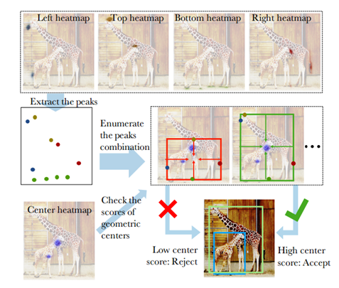 中心点:计算四个极值点的中心,如果该点的heatmap值大于0.1,则找到了一个物体,输出结果,