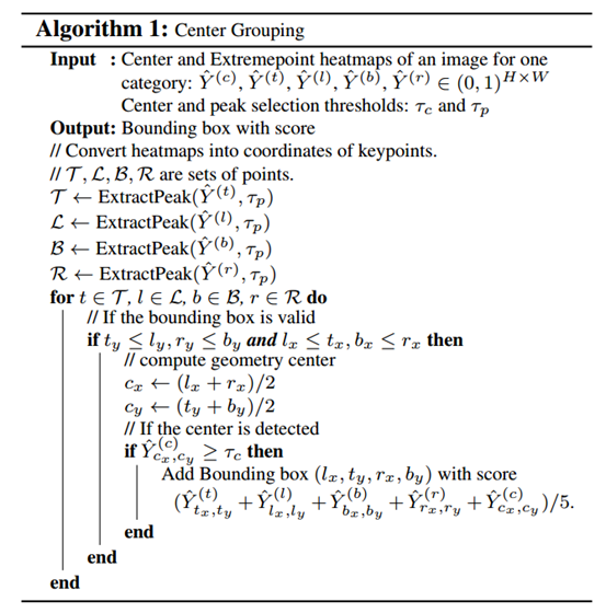 如果四个极值点的中心 (l+r)/2, (t,b)/2和网络预测的中心点重合的话,就当成一个物体输出。
