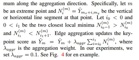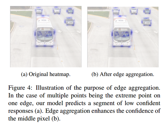 对于边缘水平或者垂直的物体,找四个极值点的时候可能会比较分散,各个水平(垂直)的位置都会有响应,因为都是物体的极值点,这就造成的大家的响应都不高,容易造成FN,文章提出一种聚合的方法,将相应通过水平和垂直的方向进行聚合,具体方法如下: