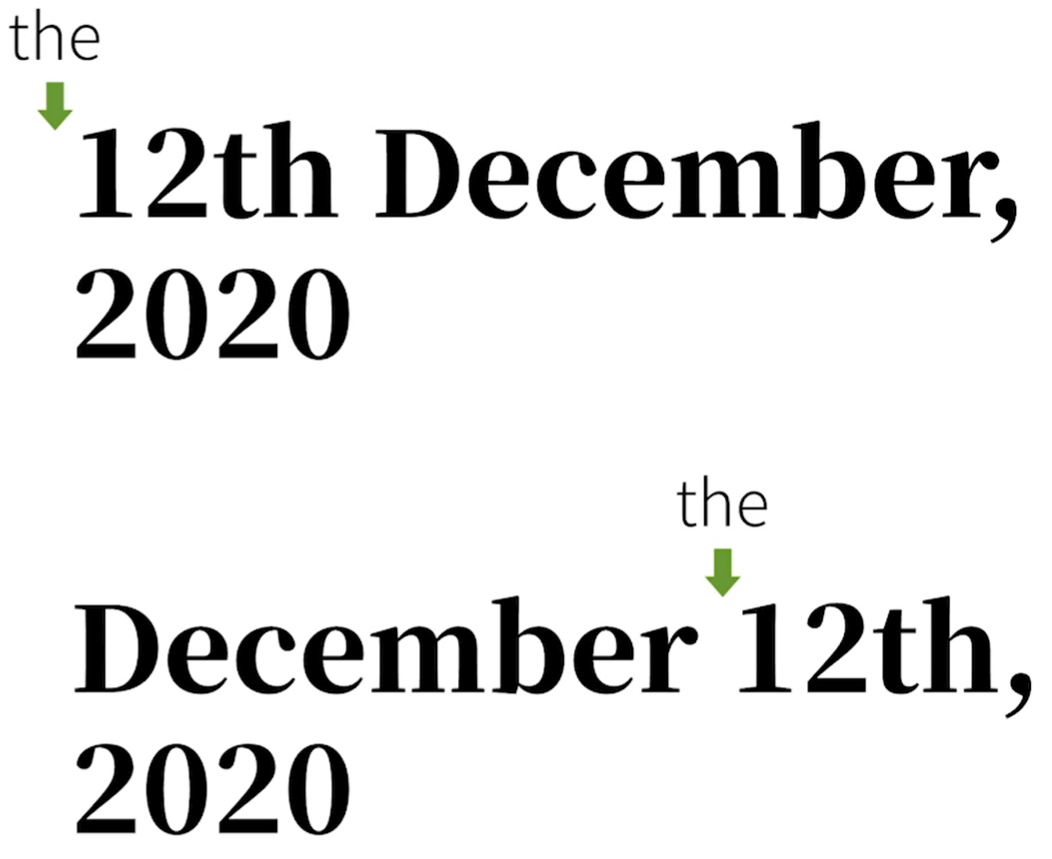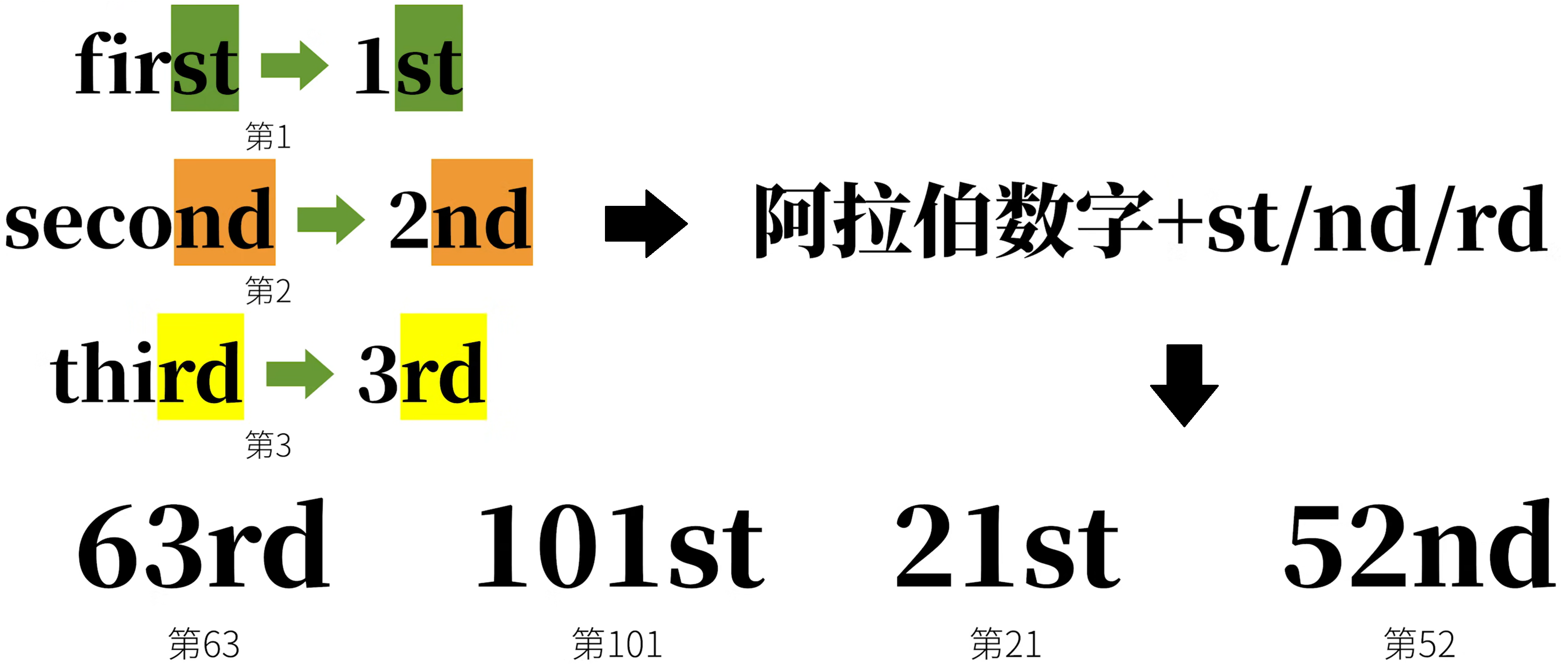 - 而第1、第2、第3以及20以上且以1、2、3作为个位数的序数词(第11、12、13不受影响),缩写是“阿拉伯数字+st/nd/rd”。