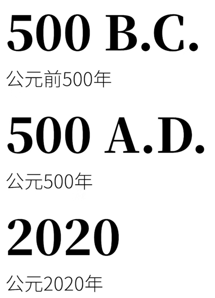 年的公元前(英语Before Christ,"基督前")与公元(拉丁语Anno Dominil,"主的年份")表达: