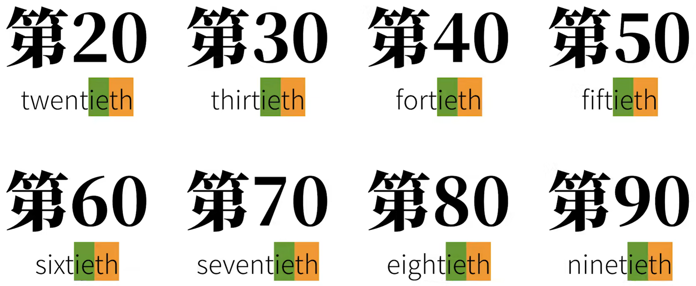 - 所有第整几十都是基数词“变y为ie”,再加后缀“-th”;