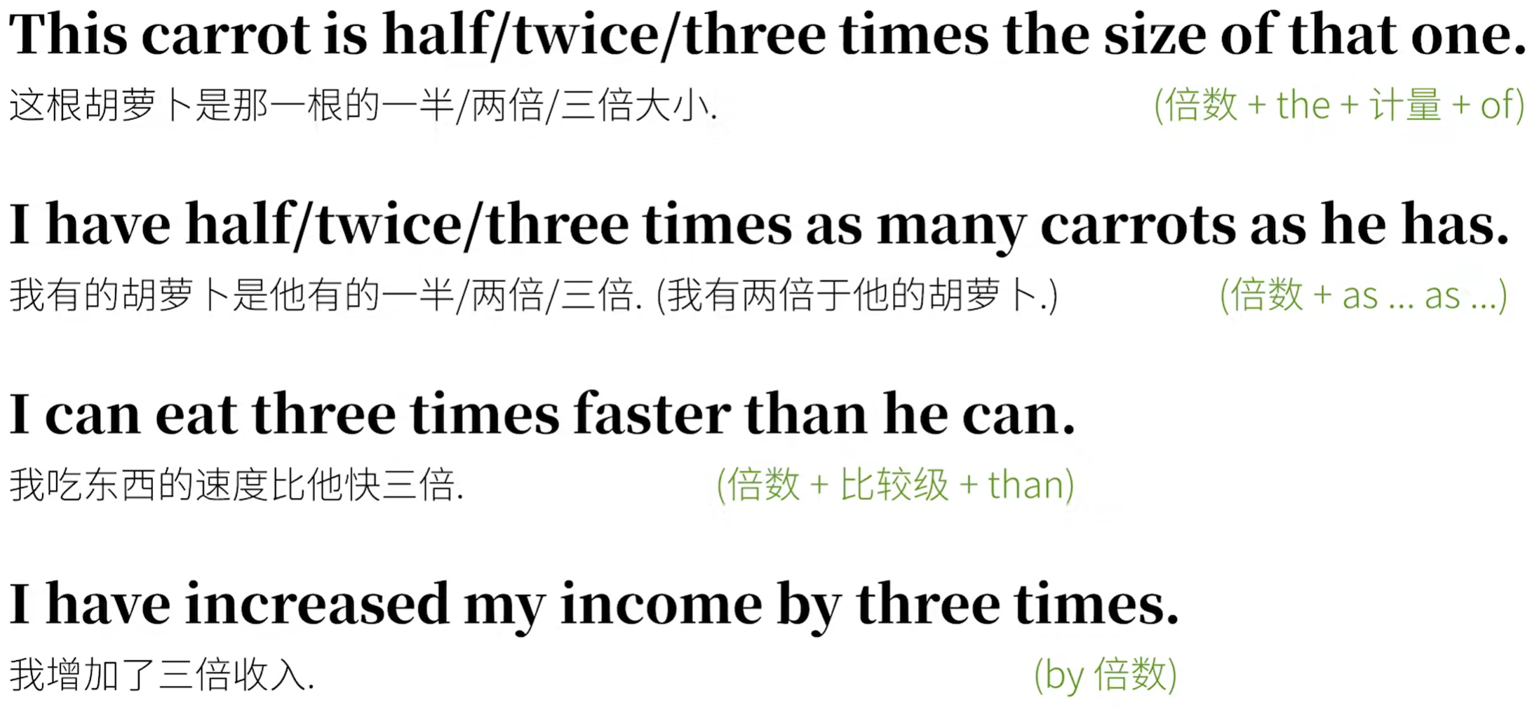 通常使用“half(一半的)”、“twice(两倍的)”、“three times(三倍的)”这样的词搭配固定表达: