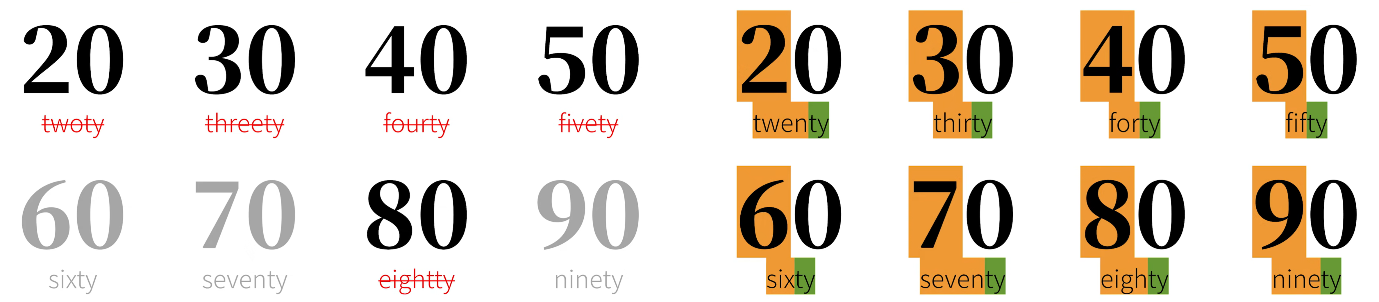 - 只有60、70和90是直接添加后缀,其余都需要进行一定的变形后添加后缀;