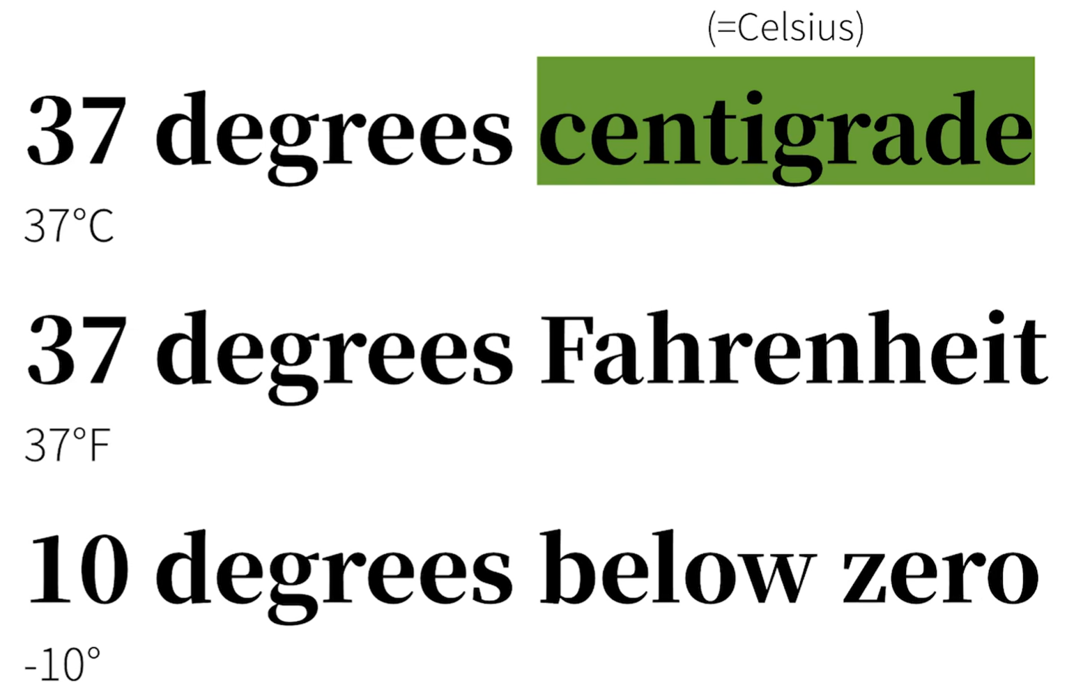 需要加后置定语修饰限定该温度是摄氏度还是华氏度。在大家知道温度是摄氏度的情况下,可以省略centigrade/Celsius(摄氏的):