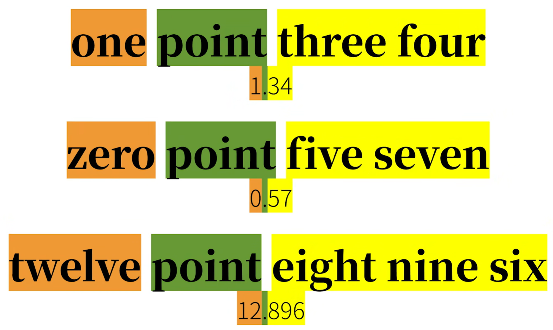 小数点左边部分按基数词写,小数点右边部分按顺序写出个位基数词:(与中文读法一致)