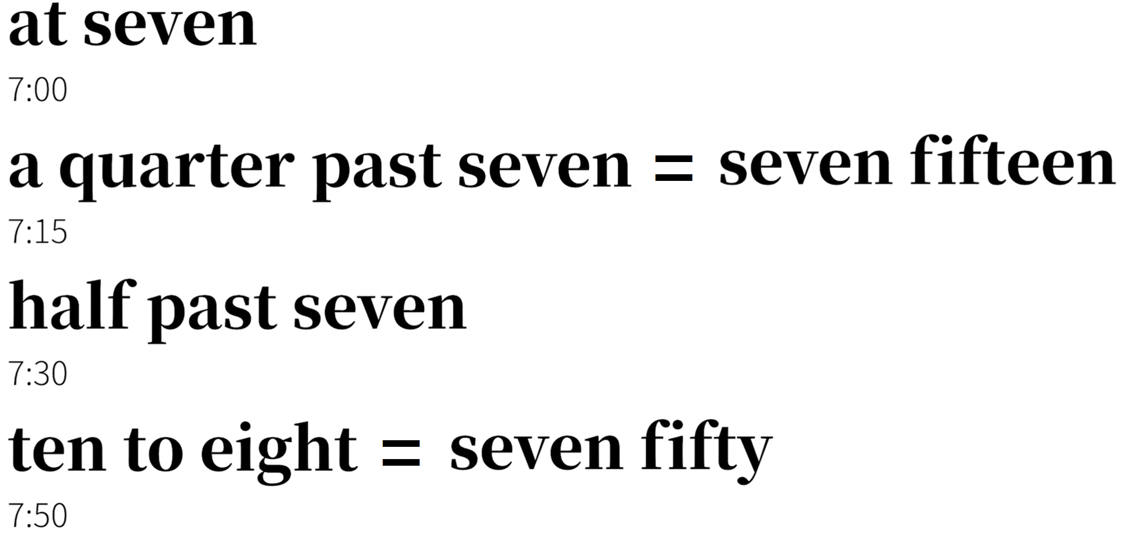 一般情况下半点之前可以用past(过)来表达,半点之后可以用to(差)来表达;当然直接按照具体时间来读也是没有问题的: