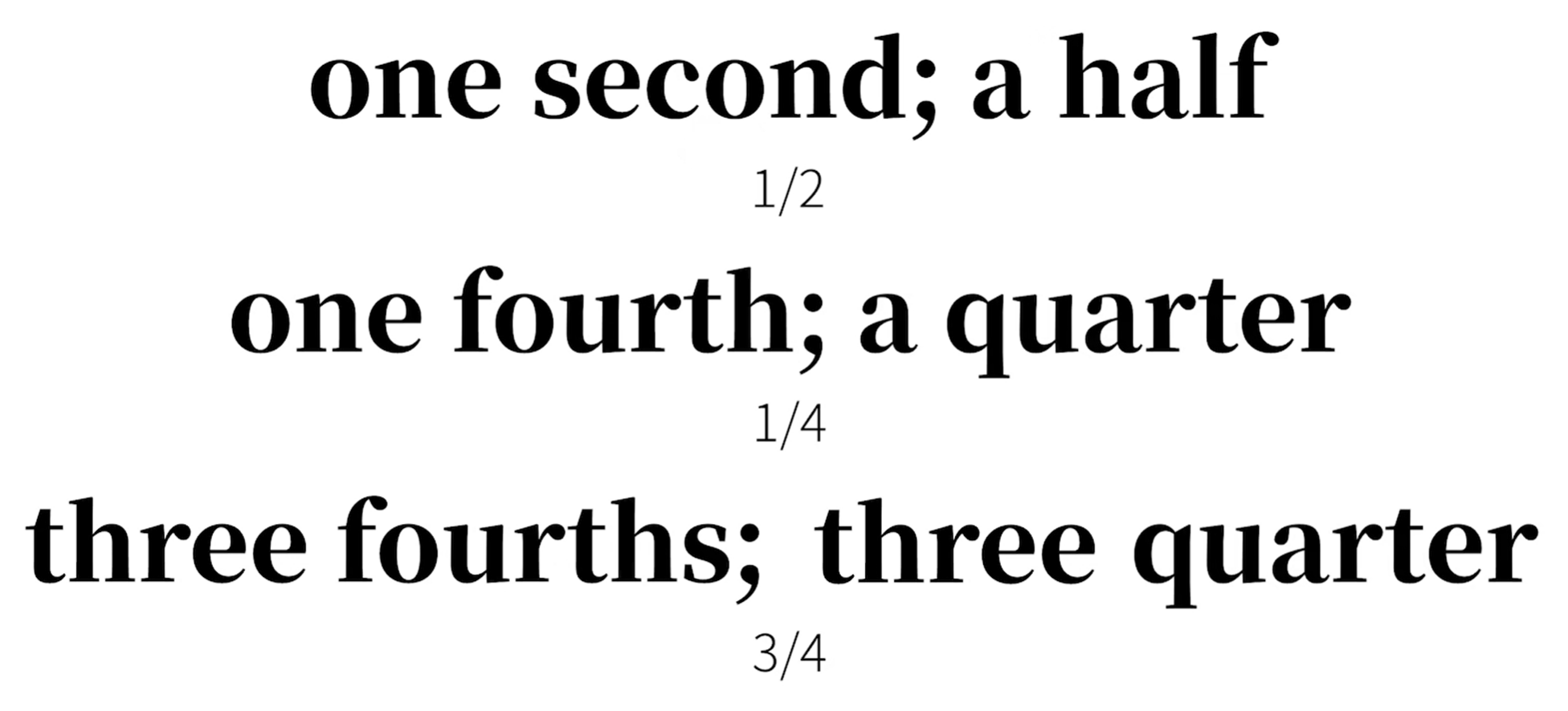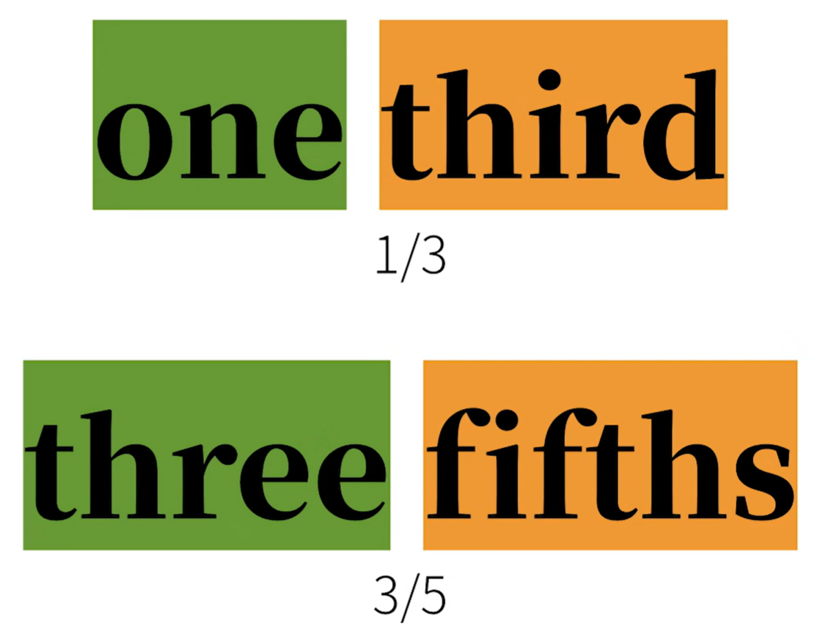 由基数词和序数词共同组成,左侧的分子用基数词,右侧的分母用序数词,且分子大于1时分母需要加s变复数: