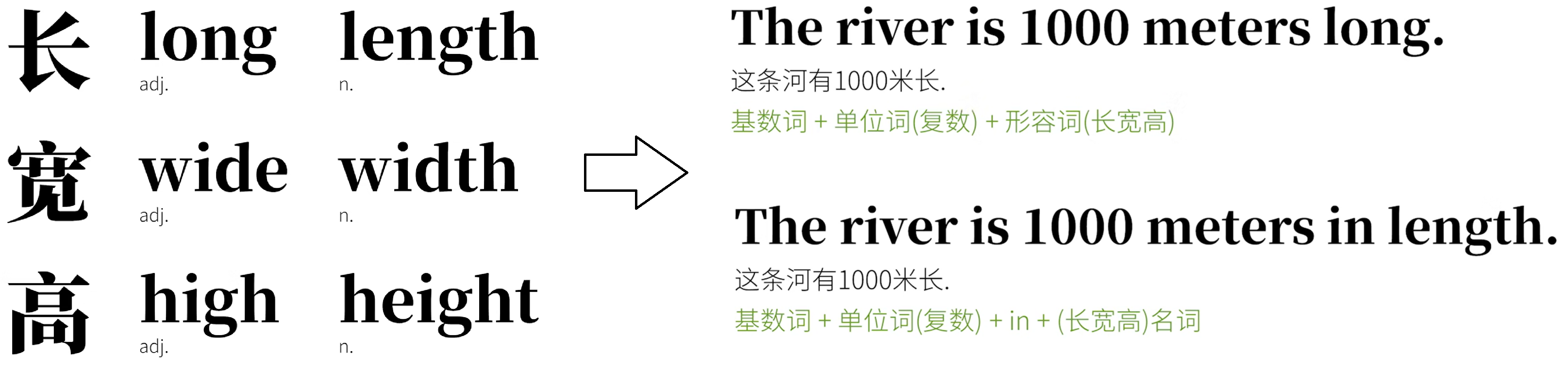 使用长度单位的有长宽高三组“adj.&n.”,通常用法有以下两种,其中形容词/介词短语(介词+名词)用于修饰限定前面的数量短语: