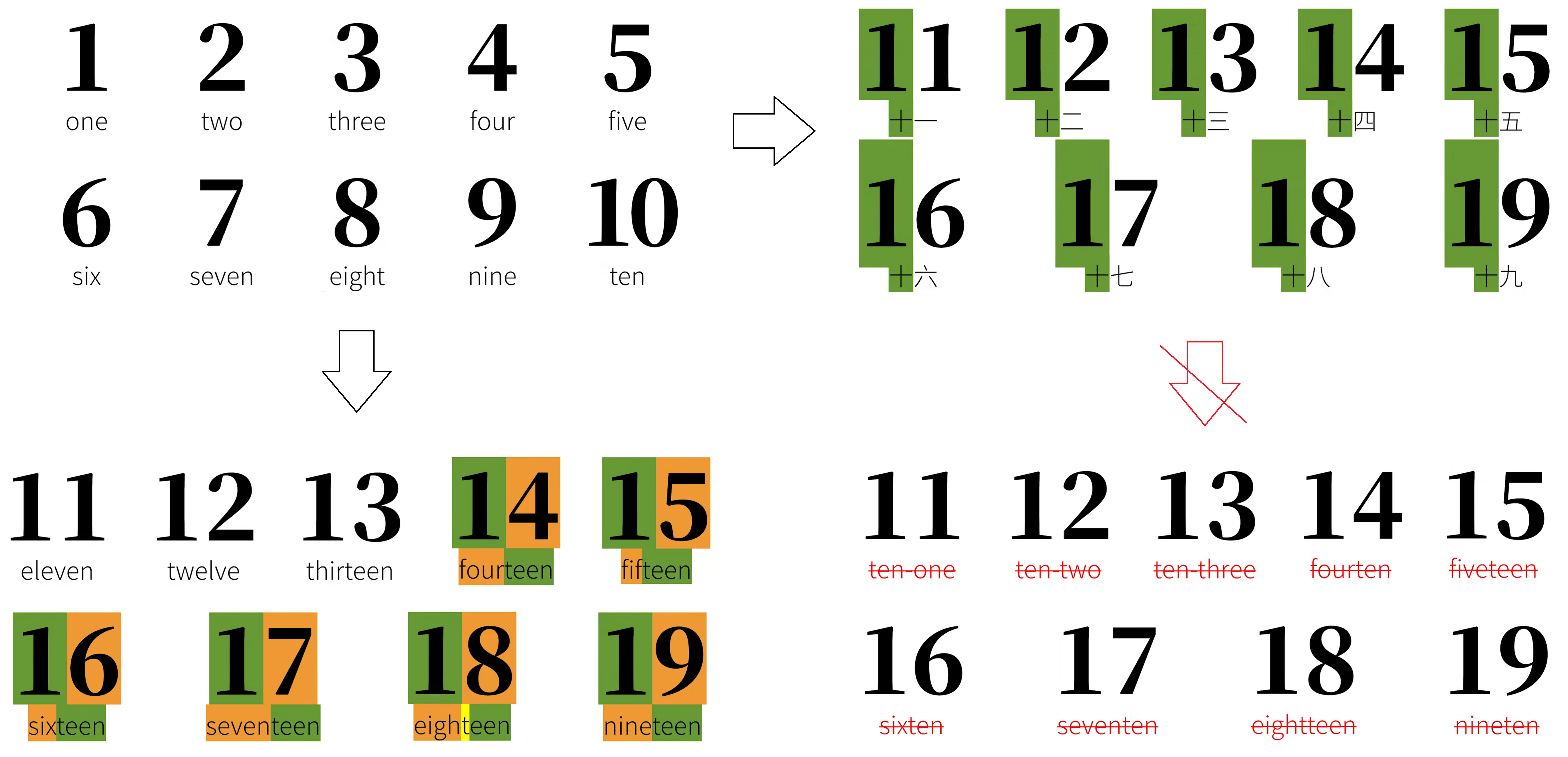 在英文中数字1-10变为11-19,无法像中文里一样直接在前面添加“十”,而是要经过很多特殊的变形: