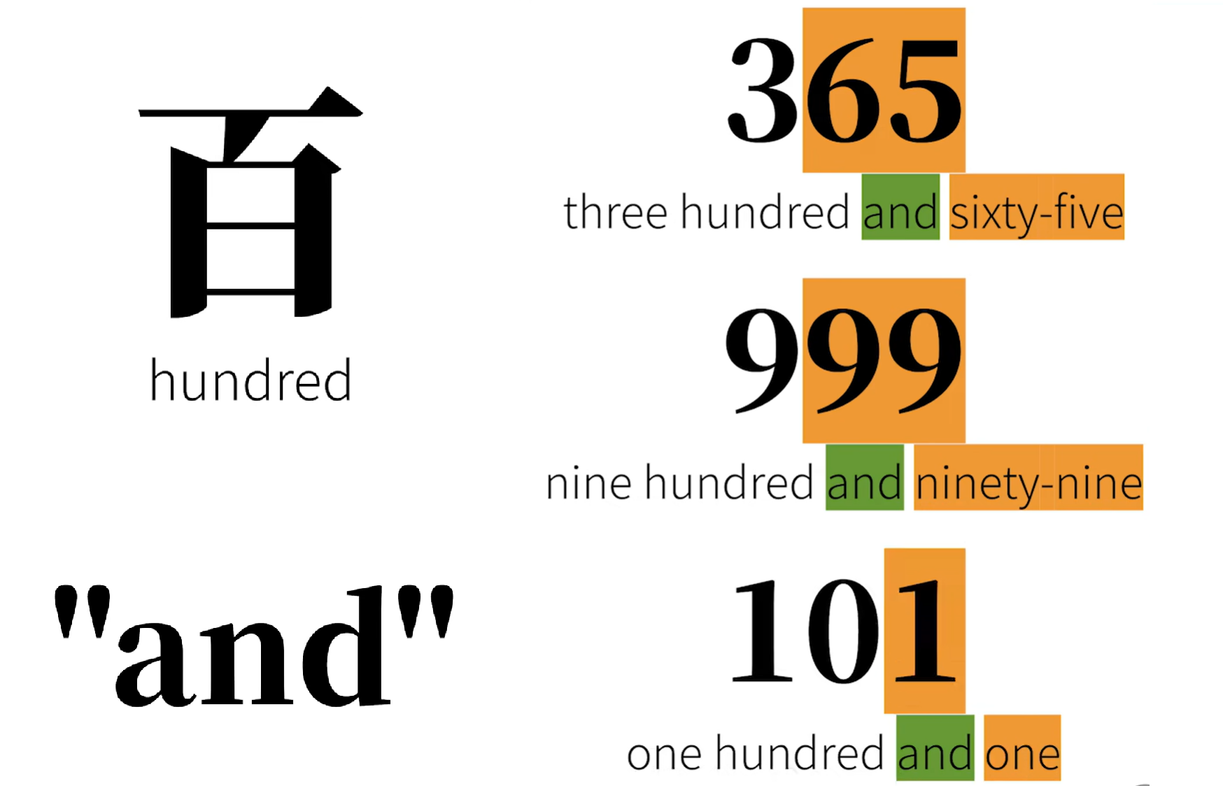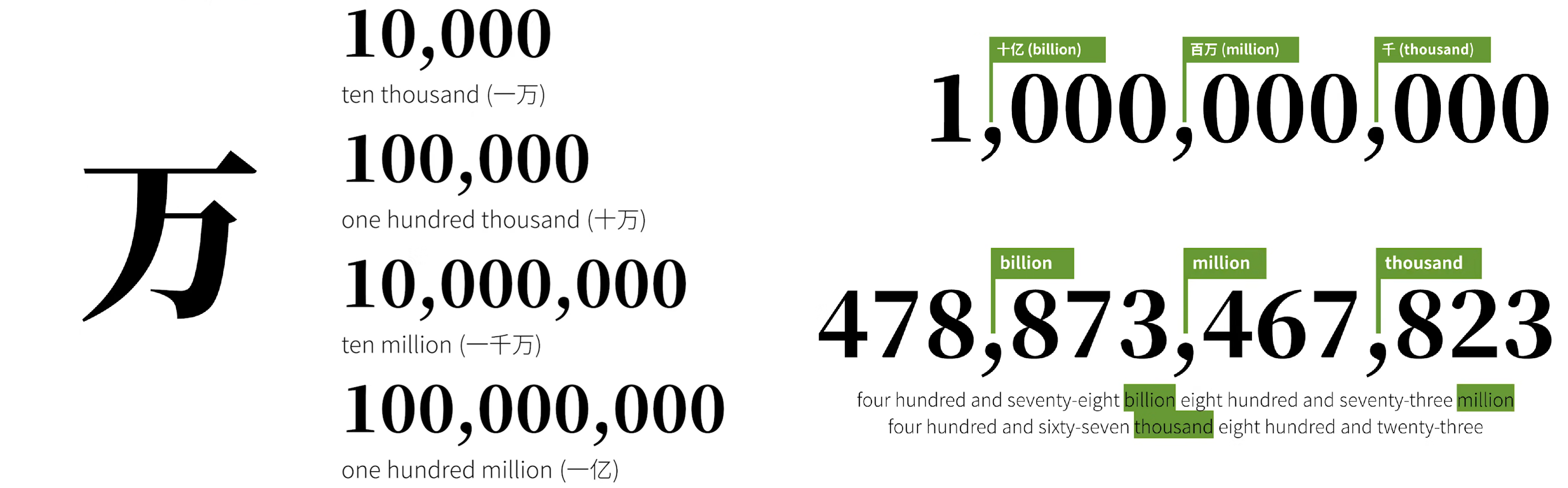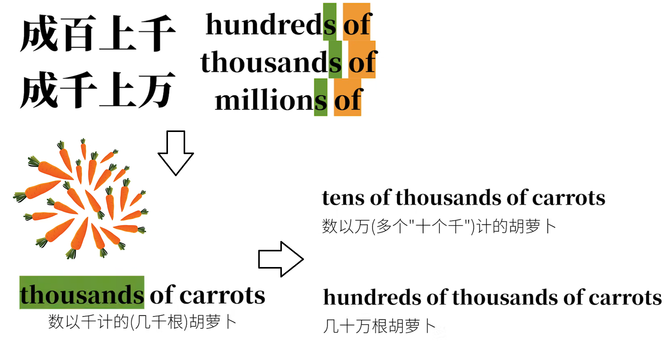 - 不同于中文里的按“万”划分法,英语里一般是按“千”划分,即每三位一划分。所以“千”再往上只有“百万”、“十亿”这样的单位;