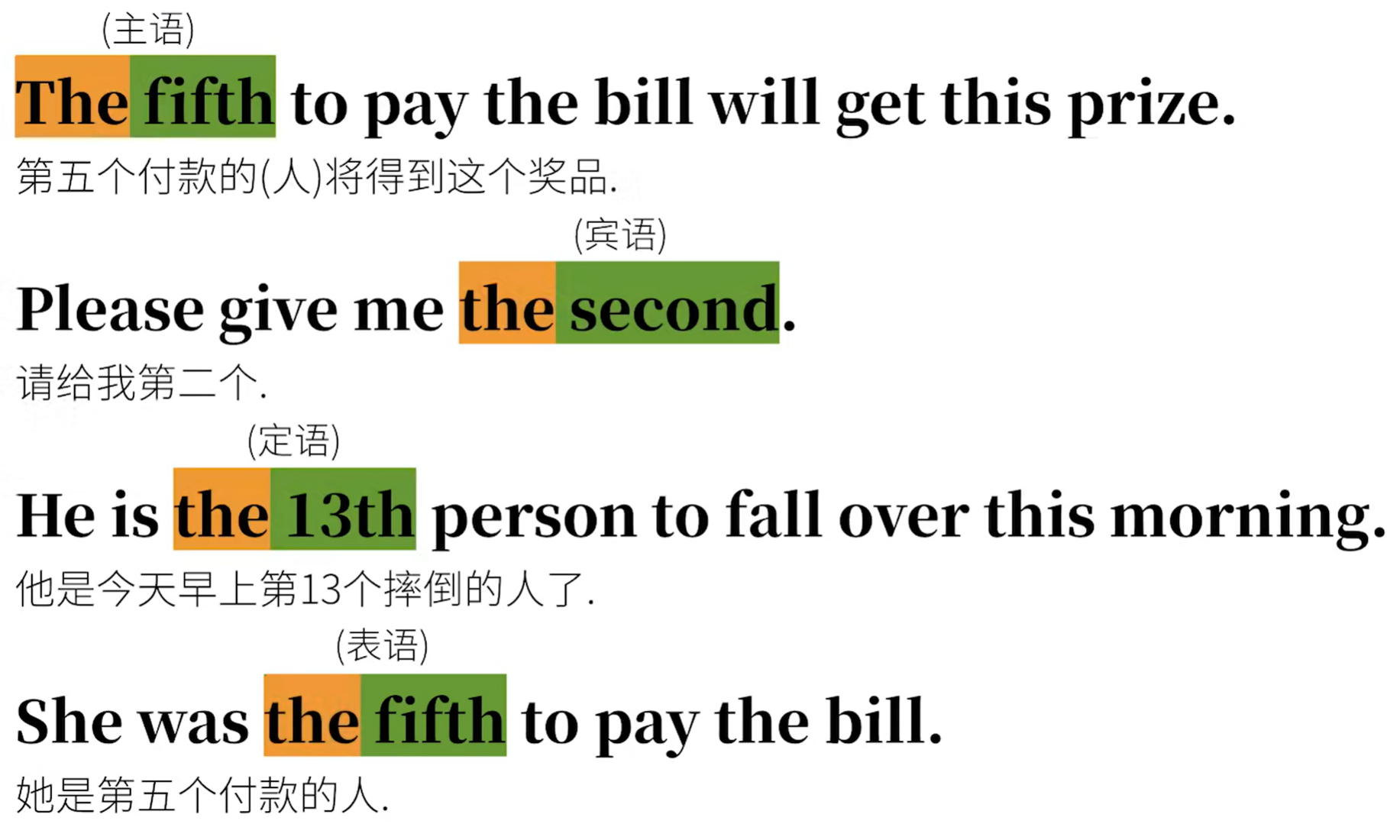 序数词可以充当的句子成分和基数词差不多,都是主语、宾语、表语和定语:
