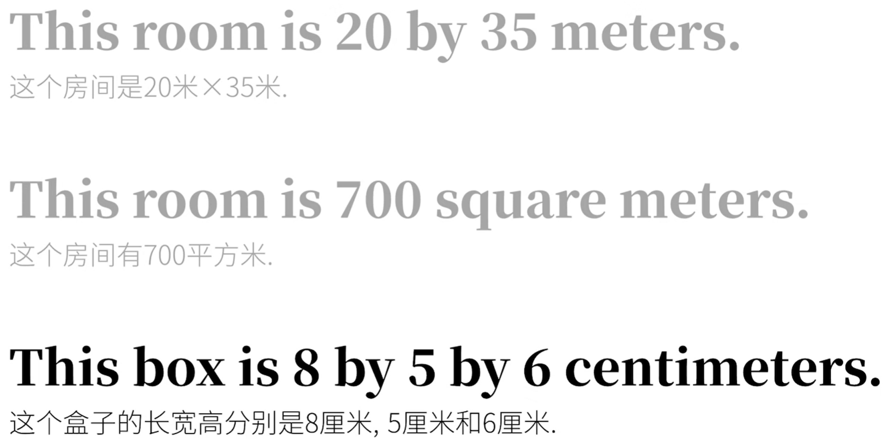 通过“by”连接多个基数词,代表不同维度的长度;或用“square(平方的)”等形容词来修饰量词,则可直接在前面加上单个基数词表面积/体积: