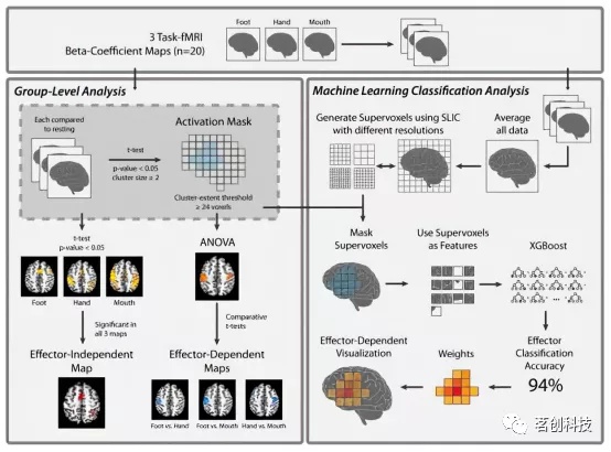 使用机器学习分类分析识别效应器依赖区域:使用机器学习分类分析来确定来自多个区域的大脑活动是否可以一起预测使用了哪个效应器,并确定哪些大脑区域对预测的贡献最大。首先对每个参与者的效应器进行参与者水平的全脑图平均(图2a),然后对所有参与者(图2b)进行平均,以创建一个单一的全脑图。图中的每个体素代表一个平均β系数值,代表所有参与者、所有效应器和所有任务中BOLD信号变化的平均百分比。然后根据数据驱动算法识别超体素(图2c)。超体素降低了计算复杂度,通过迭代增加允许的超体素的数量,能够确定空间分辨率和分类器性能之间的关系。