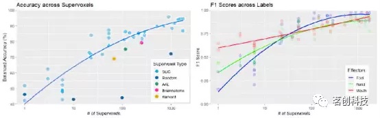 分类分析:当增加允许的特征数量时,该模型能够更好地预测正在使用的效应器。图6中显示了所有超体素模型的精度模式,表明在大约100个超体素时性能超过80%。使用1755个超体素,模型精度达到94%。AAL、Brainnetome和Harvard-Oxford皮层地图的精度也低于SLIC超体素。随着空间分辨率的增加,超体素模型在区分效应器方面表现良好。每个模型中每个效应器的F1得分显示了分类复杂性的不同趋势(图6B)。仔细观察会发现,当使用较低数量的超体素(即较低的空间分辨率)时,很难对脚效应器图进行分类。这表明脚需要更大的空间分辨率才能更好地进行分类。嘴效应器在分类上的提升不如脚陡峭,这表明即使在相对较低的空间分辨率下,嘴效应器在fMRI数据中也更加显著。手效应器位于其他两个效应器之间,并遵循与脚效应器映射相似的趋势。