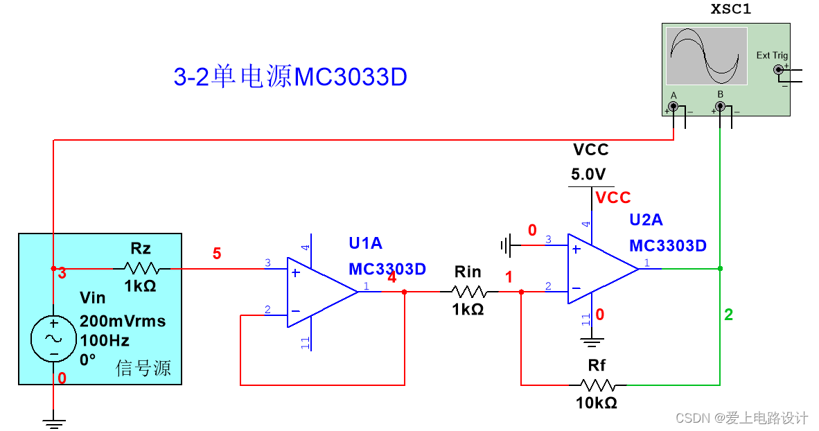 但是更换MC3033D运放仿真,如下图所示,可以得到双电源的效果,这是不正确的,可能是仿真模型的原因。