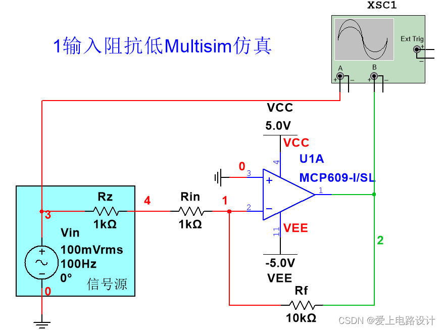 如上图,信号源内阻Rz和Rin串联,根据反相放大器公式Vout = -Vin*Rf/(Rz+Rin),Vout = 10k/(1k+1k) = 5倍。