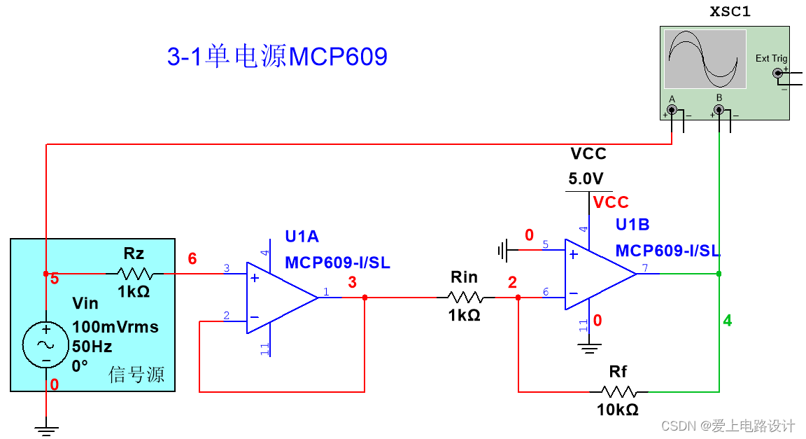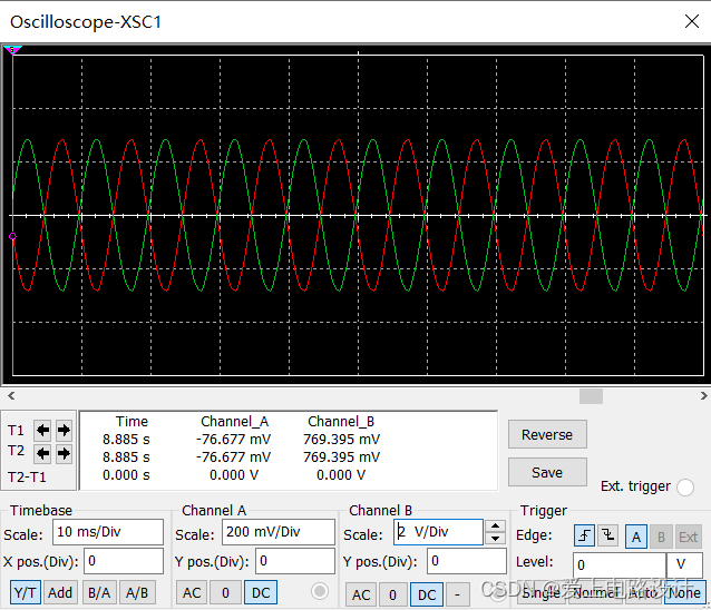 从仿真图也可以得到验证,输出Vout在Channel B上与信号源Vin在Channel A上的幅值相等。故放大倍数Vout/Vin = Channel B/Channel A = 5倍。