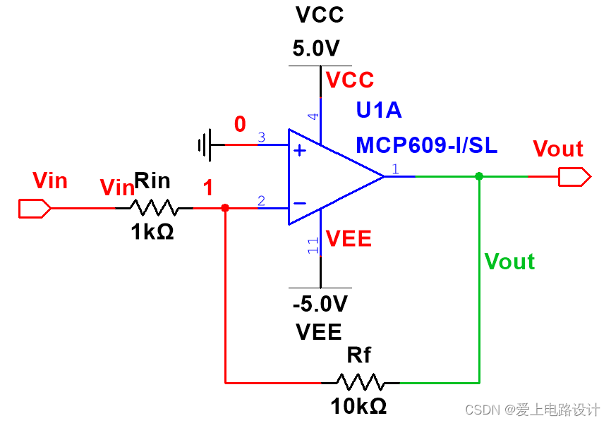 根据公式,Vout = -Vin*Rf/Rin,可得知放大倍数为10K/1K = 10倍。