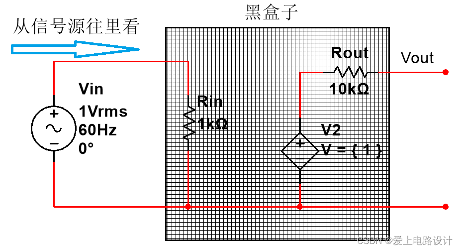 如果把整个放大电路看成一个黑盒子(如下图),从Vin信号源处往黑盒子里面看,Rin决定了反向放大器的输入阻抗,所以此反相放大器的输入阻抗就为Rin = 1K。