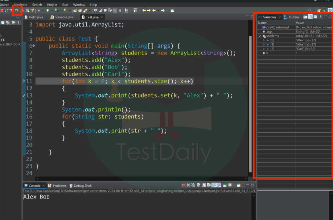 此时我们可以看到,名为students的ArrayList已经被创建,并且已有三个元素(“Alex”,”Bob”,”Carl”),此时程序停留在第13行。此时我们点击step over按钮,程序将继续往下执行,并且右侧的变量值也会变化: