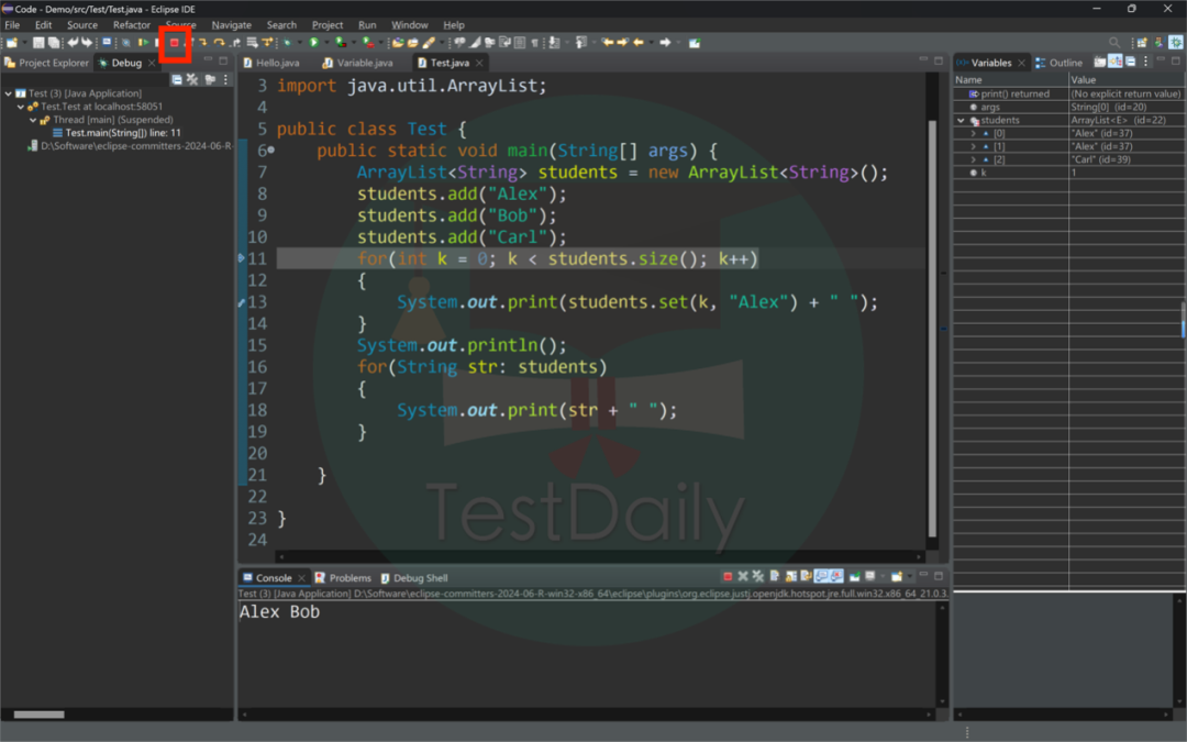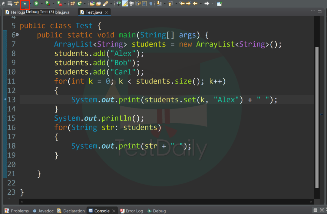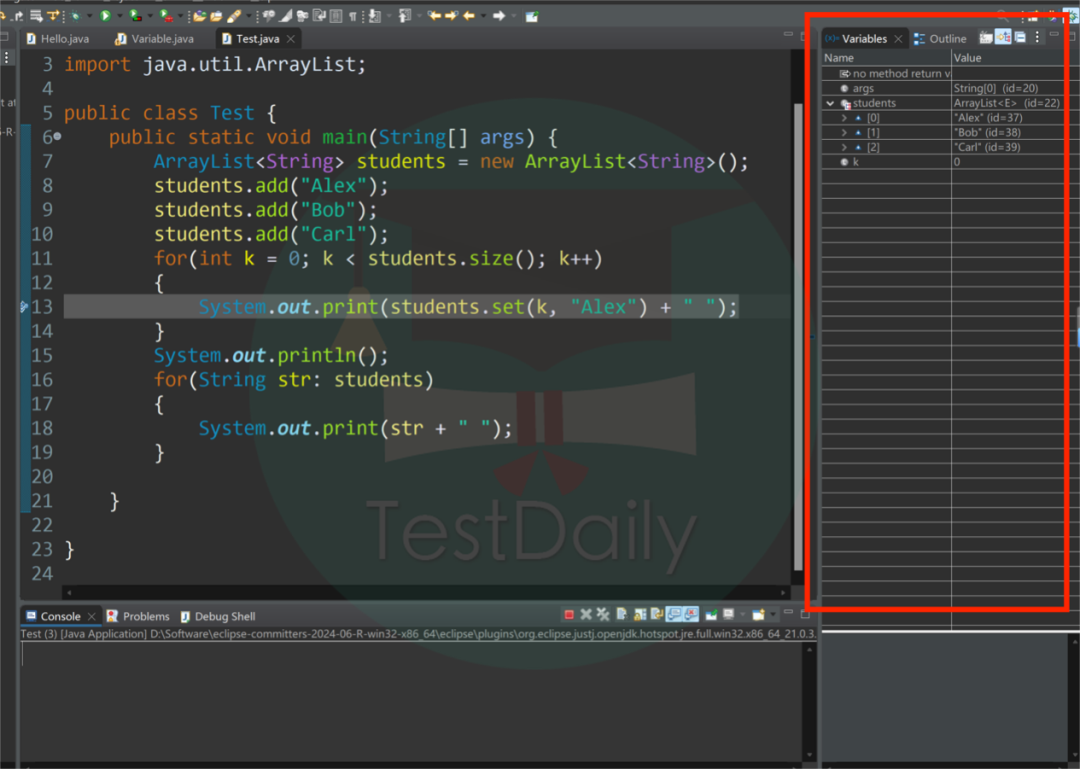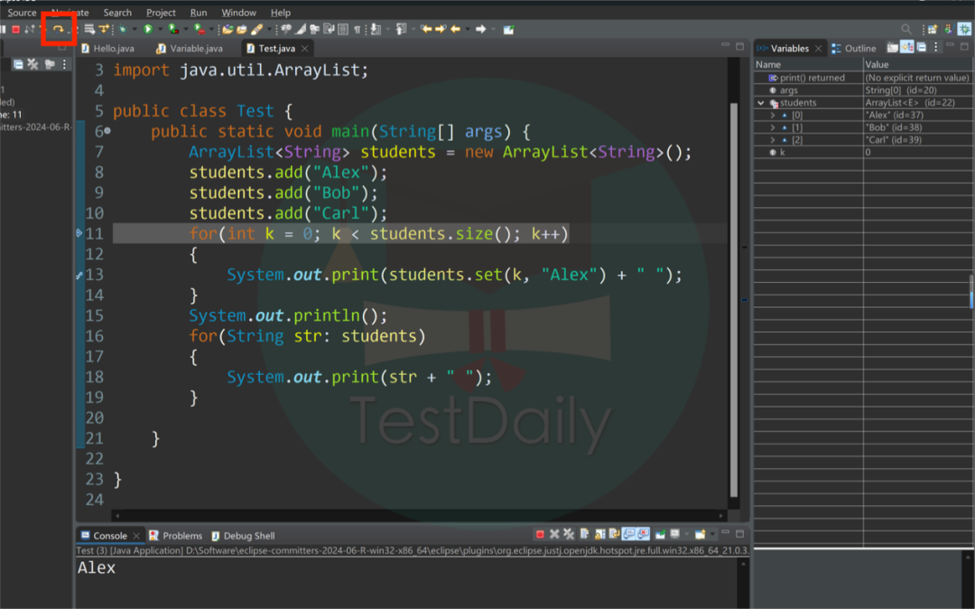 此时我们看到,ArrayList中index为1的元素也被修改为”Alex”,Console中输出了该位置之前的值。同理我们可以执行第三步,那么我们就会看到”Carl”被打印输出在了Console中。