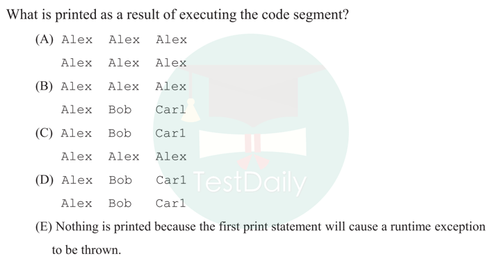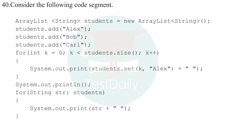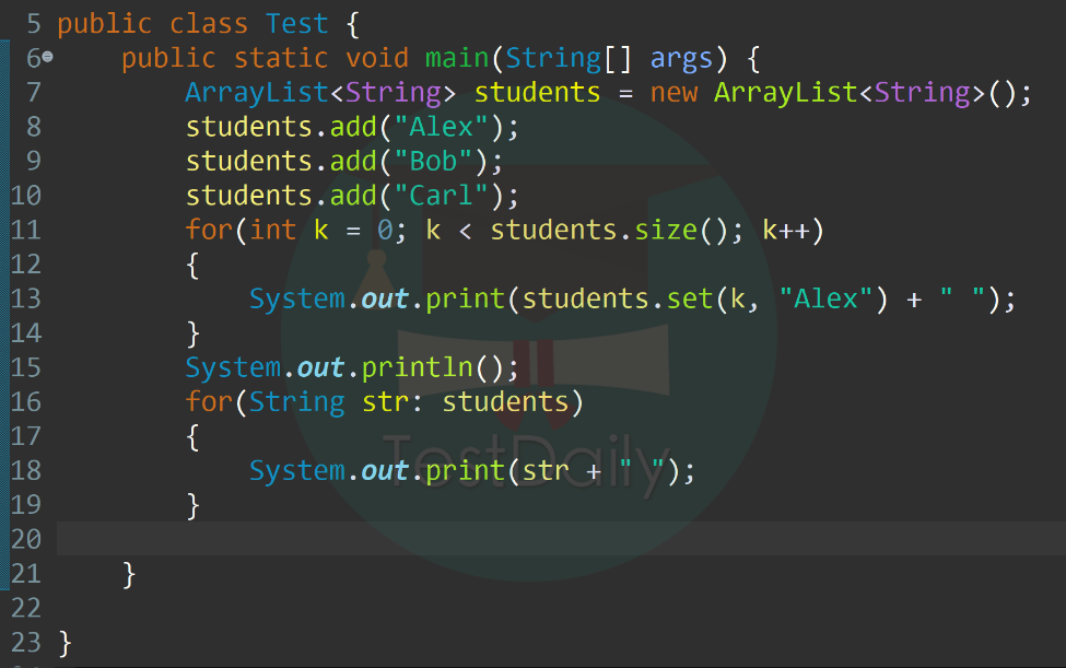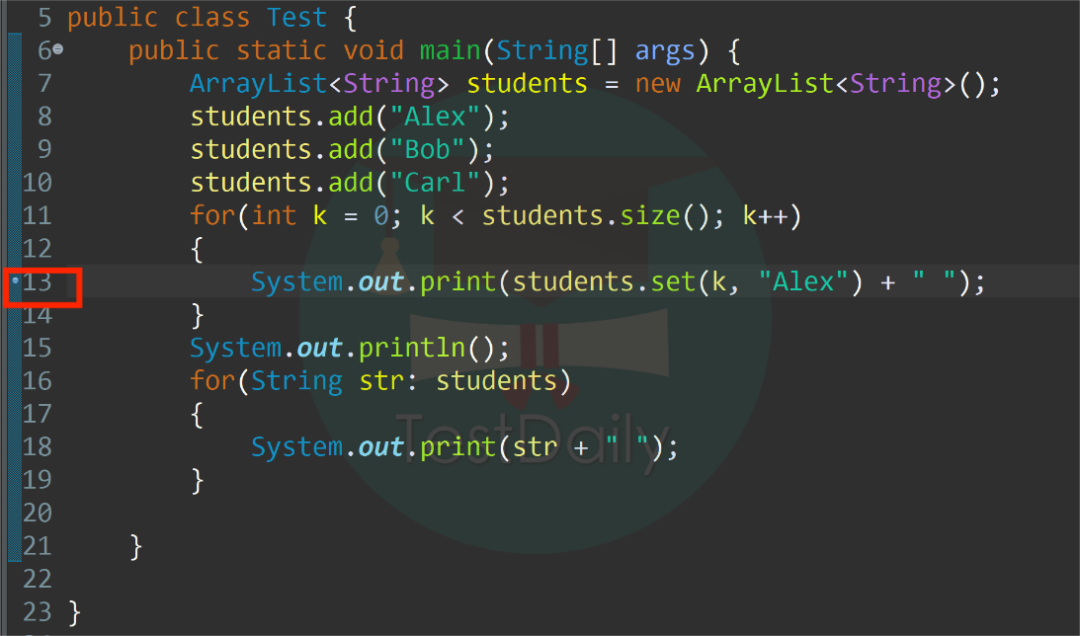 通过以上一步一步的拆解,我们可以看到第一行的打印输出结果是students中初始的三个元素值,但是打印 输出的同时,set方法还会将对应index位置的元素更改为”Alex”,这是由于set(int index,E obj)方法不但会修改index的值为传入的参数obj,还会同时输出当前位置之前的值,那么之前的值会被打印到console中,因此我们就看到了第一行是”Alex”,“Bob”,“Carl”。