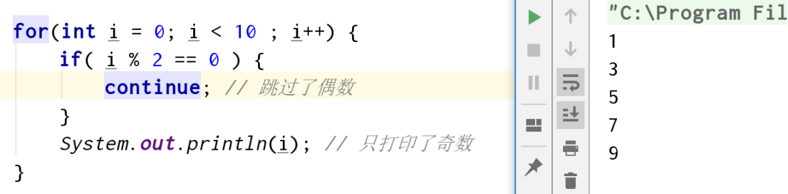 而continue则是跳过这次循环,继续下一次循环的意思。