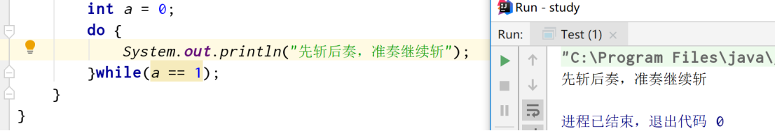 可以看到while里的条件为假,但还是打印了一次”先斩后奏,准奏则继续斩”,即条件为真则继续循环,不为真则结束。