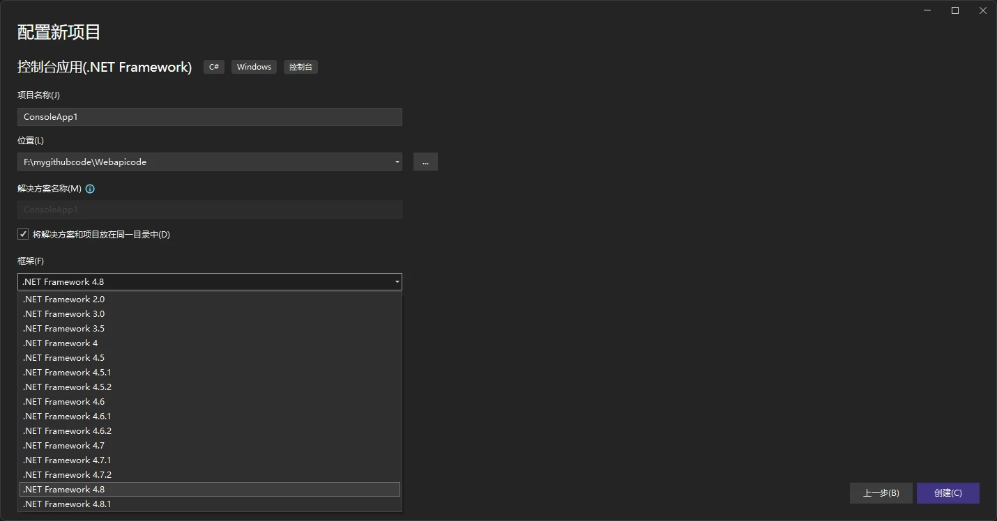 在点击下一步后,我们需要给我们的项目起一个名字,已经指定项目存放的位置,框架选择之前我们所下载的4.8。