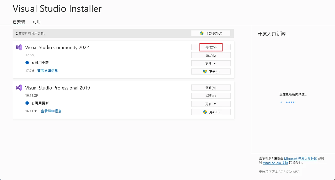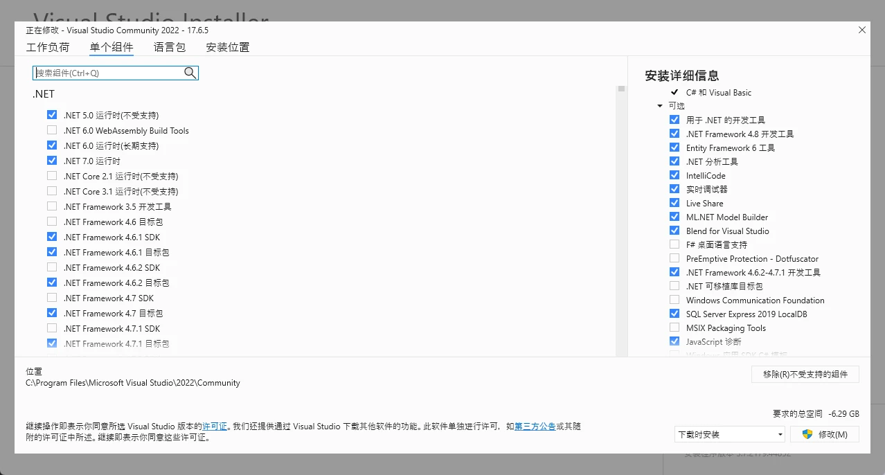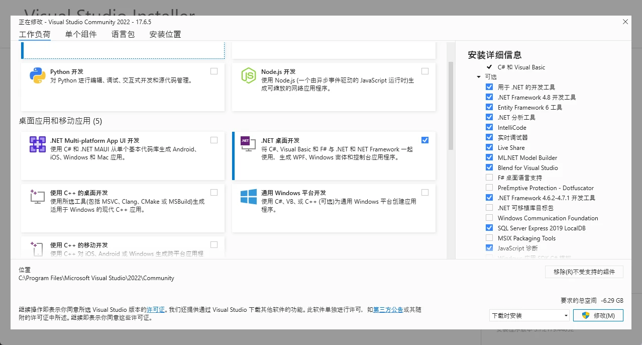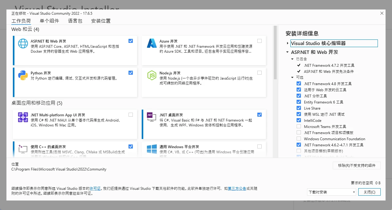 我们主要需要安装的就是.net桌面开发应用,在可选项中安装framwork4.8工具和.net6工具。