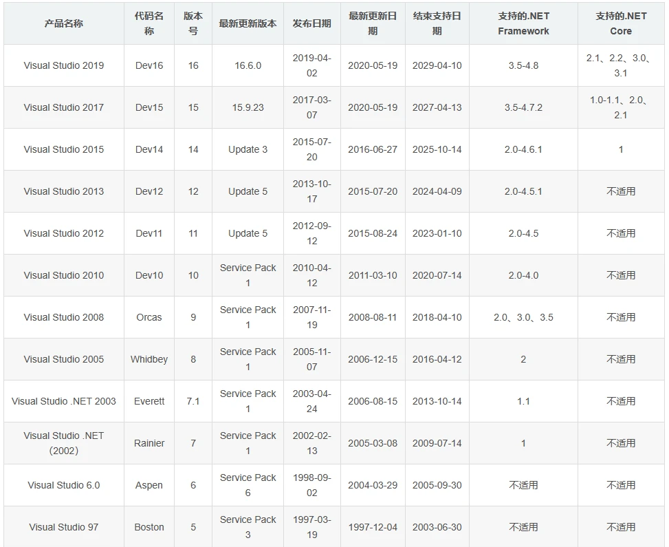 以下是编译器的发展历程以及器所支持的平台版本: