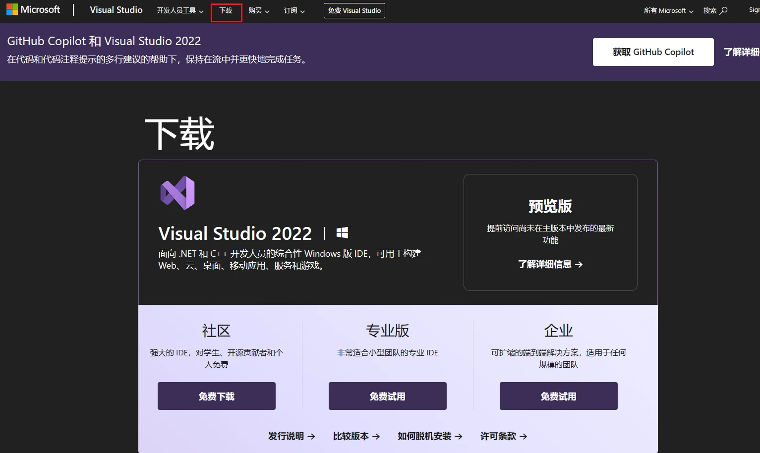 C#作为微软开发的语言,其主要的编译器自然也是由微软开发的。在微软的官网上我们就可以发现编译器VisualStudio的跳转链接。