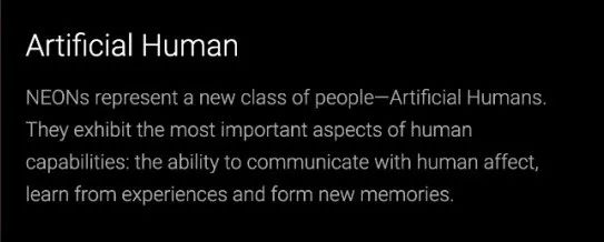 在2020年国际消费电子展上,STAR Labs推出了NEON,据称它是世界上第一个“人造人”。NEON可以像人类一样交谈和同情。因此,它们不仅可用于营销活动,而且是未来的虚拟助手。目前,该技术还处于早期阶段。