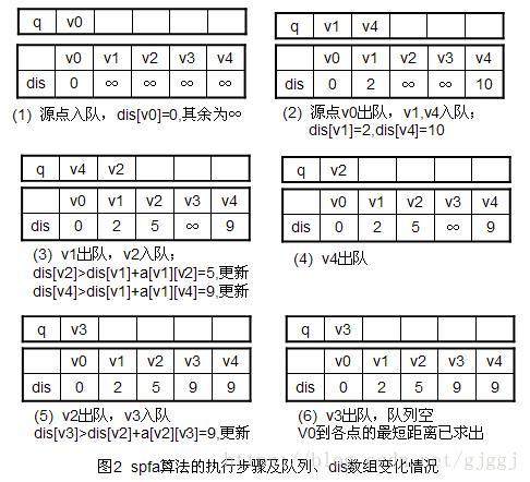 - 若是(重点),则dis【v】赋值为dis【u】 + u到v的权值,然后把path【v】的前驱结点位置设置为u的位置,并把V结点放入队列中(若本身在队列中则不需要),进行下一结点判断