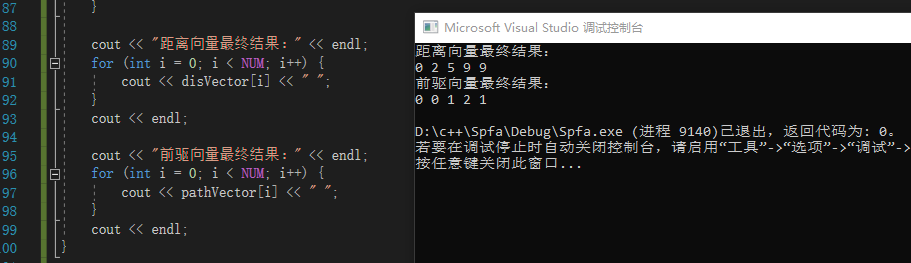 讯享网struct spfaNode { map<int, int> disMap; int num = 0; int index; }; vector<spfaNode*> allNodes; for (int i = 0; i < NUM; i++) { spfaNode* node = new spfaNode; node->index = i; for (int j = 0; j < NUM; j++) { if (spfaMap[i][j] != INT_MAX) { node->disMap[j] = spfaMap[i][j]; } } allNodes.push_back(node); }