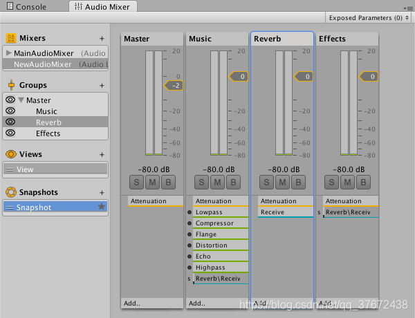 AudioMixer中所有可用的参数都可以改变它们的变化方式. 转换方式是以snapshot来定义的