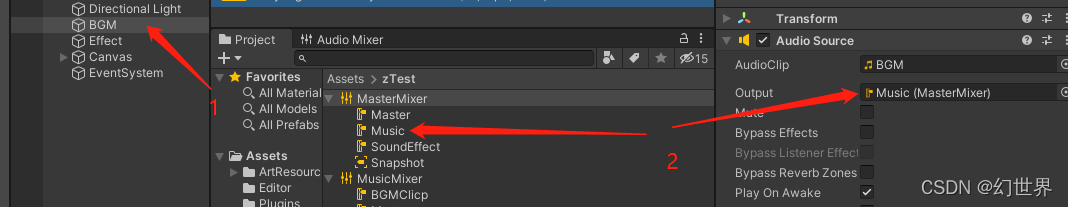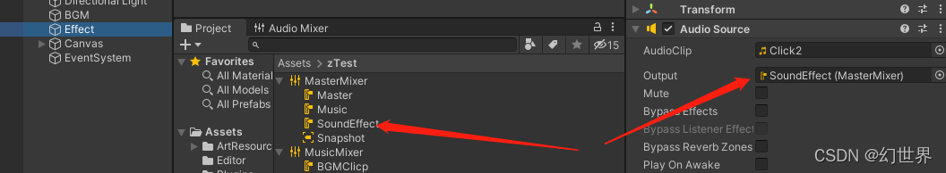 分别选中场景里的音乐,然后把对MasterMixer下对应的类型拖拽进音乐的Output槽内