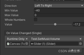 public class Test : MonoBehaviour { public AudioMixer audioMixer;//MasterMixer public AudioSource soundClick;//sound public void SetAllVolume(Slider s) { audioMixer.SetFloat("MasterVolume", s.value); } public void SetMusicVolume(Slider s) { audioMixer.SetFloat("MusicVolume", s.value); } public void SetEffectVolume(Slider s) { audioMixer.SetFloat("EffectVolume", s.value); } private void Update() { if (Input.GetKeyDown(KeyCode.P)) { soundClick.Play(); } } }
