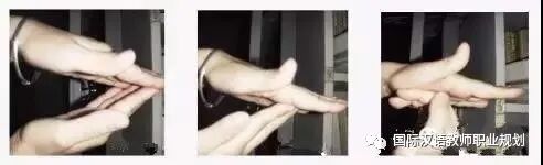 双手模拟发音器官法:用手模拟口腔与舌头,使学生体会发音器官的正确位置。 教卷舌音时,左手心向下,四指并拢,稍屈,右手心向上,手指弯曲。发塞擦音(zh, ch) 时,右手指弯屈,先顶住左手第二关节,再分开;发擦音时右手指弯屈,靠近但不接触左手第二关节。