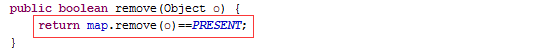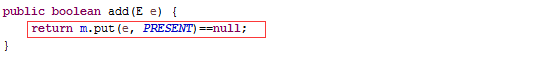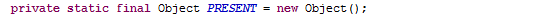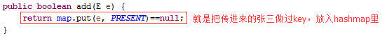 原来就是调用底层HashMap的put方法,把"张三"作为key,PRESENT作为value放在hashMap里,讲HashMap的时候讲过了,如果put时key重了,会返回被覆盖的value值(oldValue),否则返回null,这儿的HashSet又给包装了一下,如果key没有重(oldValue == null),就返回true,否则返回false。继续看这个PRESENT是什么鬼