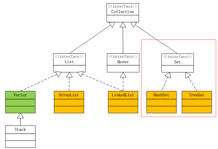 先来看看Set家族在Collection中的位置,红框里的内容就是Set的大家族了,Set接口继承自Collection。有两个很重要的实现HashSet和TreeSet。其中黄色部分前面已经说过了是要重点了解的,老规矩,上代码,大家可以先想一想以下代码的执行结果。