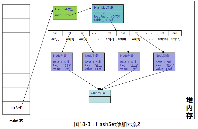 调用底层HashMap的时候,key是传进去的“张三”,value是PRESENT,也就是一个Object对象,继续往里添加“李四”,“王五”,“赵六”