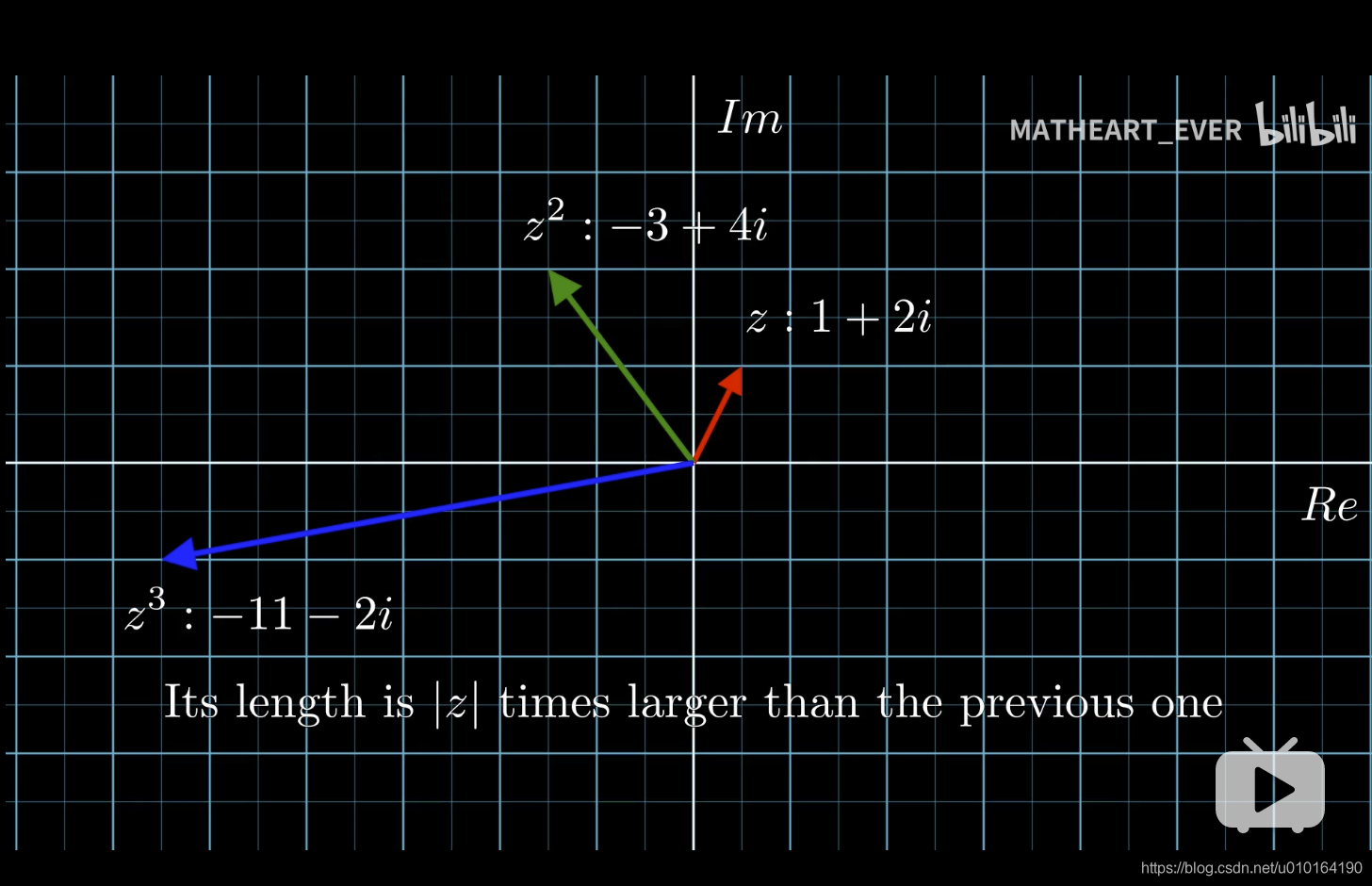 1.复数概念:形式如z=a+bi(a,b均为实数)的数称为复数,其中a称为实部,b称为虚部,i称为虚数单位。 当z的虚部等于零时,常称z为实数;当z的虚部不等于零时,实部等于零时,常称z为纯虚数。 2.例如:z = 3+2i是复数,它的实部为3(x轴横坐标),虚部为2(y轴纵坐标). z = 1 + 2i 对应坐标:(1,2); 2i表示以1+2的平开再开方的长度,左旋90度. z² = (1 + 2i)² = -3 + 4i 对应坐标:(-3,4),左旋180度. z³ = (1 + 2i)³ = -11 - 2i 对应坐标:(-11,-2),左旋270度