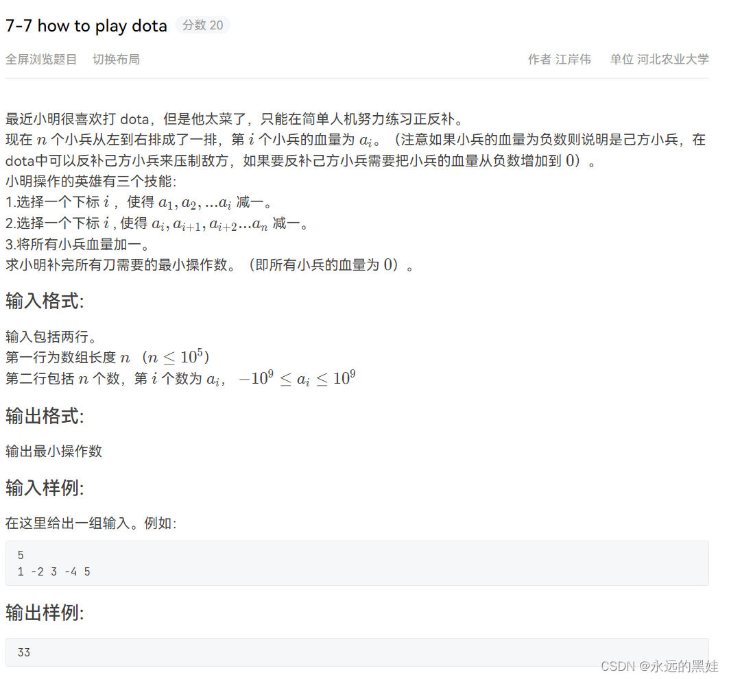 思路:我们只需将差分数组全为0即可。用以上操作即可。关键我们要从i=2开始,最后如果b[1]不为0我们对他进行(2)或(3)操作即可。