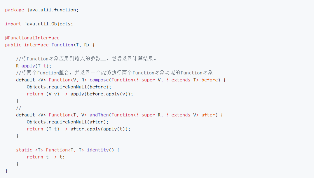 5.2.Function接口:Function 接口接受一个参数并生成结果。默认方法可用于将多个函数链接在一起(compose, andThen)
