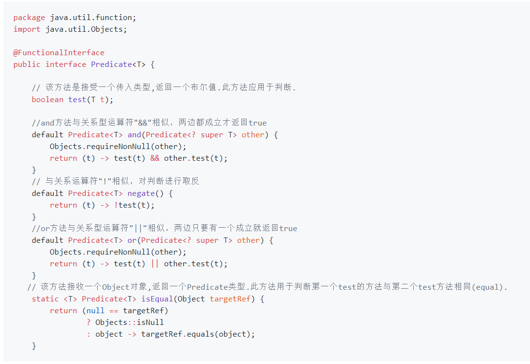 5.1.Predicate接口:Predicate 接口是只有一个参数的返回布尔类型值的 断言型 接口。该接口包含多种默认方法来将 Predicate 组合成其他复杂的逻辑(比如:与,或,非)